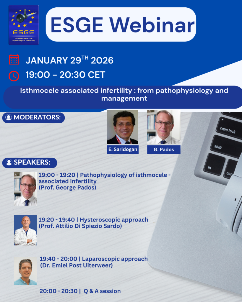 🔔 Webinar Alert Isthmocele associated infertility: from pathophysiology and management 📅 Don’t miss out — register now via the Latest News on ESGE website or via the link below: https://us06web.zoom.us/webinar/register/WN_BXI4LE1yQAugbFFW776kTA#/registration