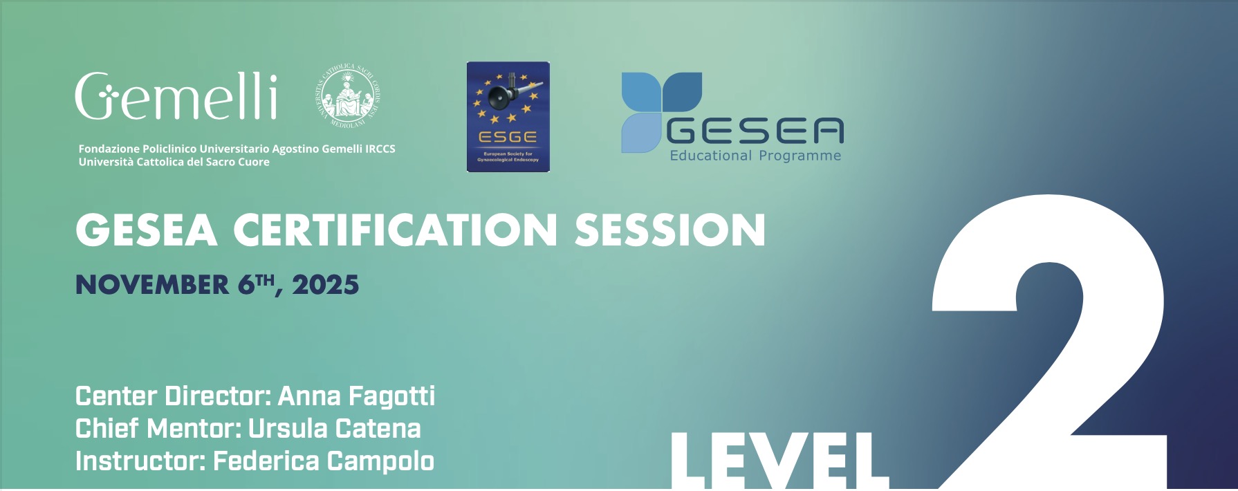 GESEA Certification Session Level 2 | Rome — Italy To register or if you have any further questions, regarding the GESEA L1 Certification Session please contact info@gesearoma.com PROGRAMME IMPORTANT: ALL PARTICIPANTS must obtain a GESEA e-Learning Certificate via academy.esge.org in the respective level prior to the GESEA Session that they are participating in.